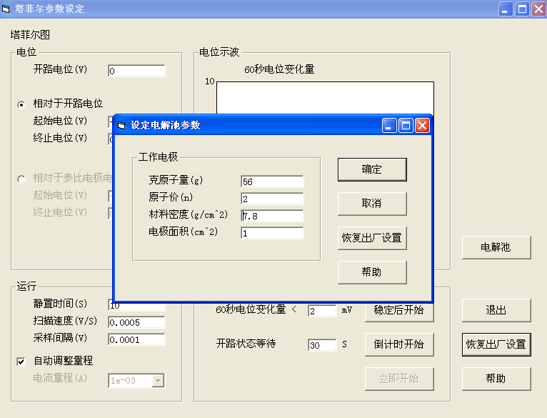 碳鋼采用默認(rèn)電解池參數(shù),如果使用其他工作電極,應(yīng)改變電解池參數(shù)后點(diǎn)擊確定。選定60s電位變化量時(shí)點(diǎn)擊穩(wěn)定后開(kāi)始,自動(dòng)電位示波,60s內(nèi)電位變化量不大于2mV,自動(dòng)開(kāi)始掃描。亦可選擇開(kāi)路狀態(tài)等待。